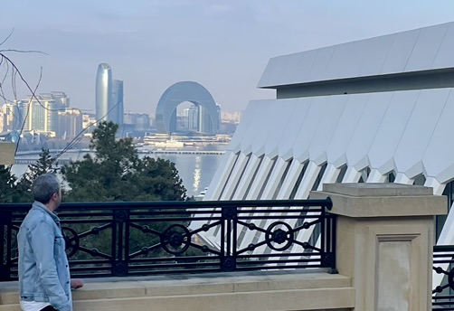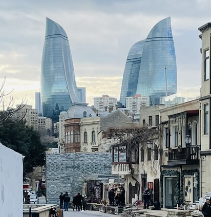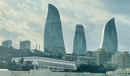 Baku rises up the hills from the Caspian sea, allowing great views of many buildings. The Crescent Development project can be seen across the bay, it is plenty modern and resembles the image on the Azerbaijani flag.