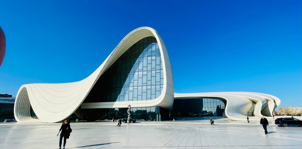 The Flame Towers above are certainly modern, but also represent Azerbaijan, which means Land of Fire. The towers don’t blend in, they provide both contrast and connection between past and future. Below are pictures of the Heydar Aliyev center by famous architect Zaha Hadid. The inside is equally interesting and houses interesting collections.