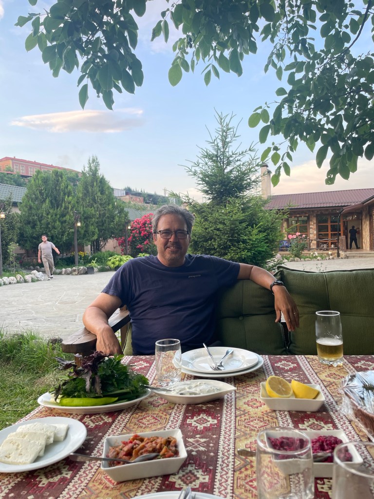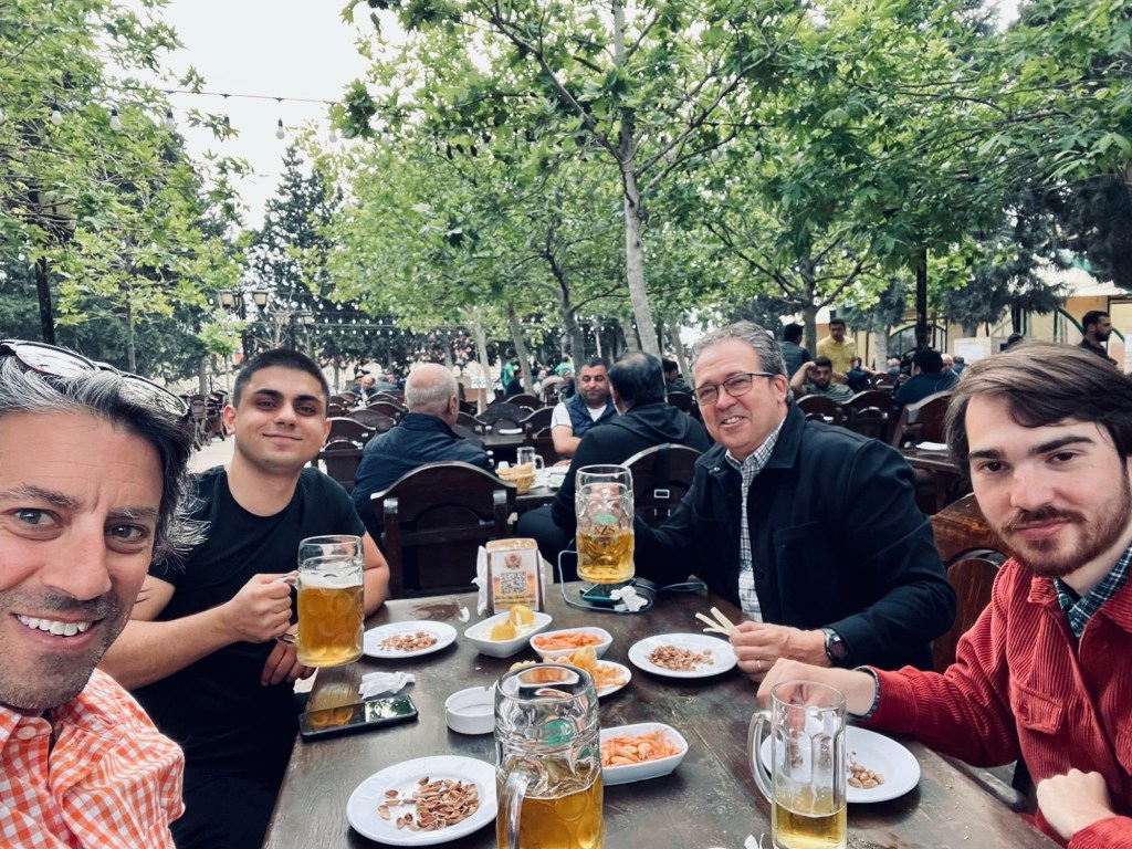 Many or most restaurants in Azerbaijan feature small dining rooms for private parties. Here we are celebrating Ibrahim’s birthday. Below, we are at a great outdoor restaurant.