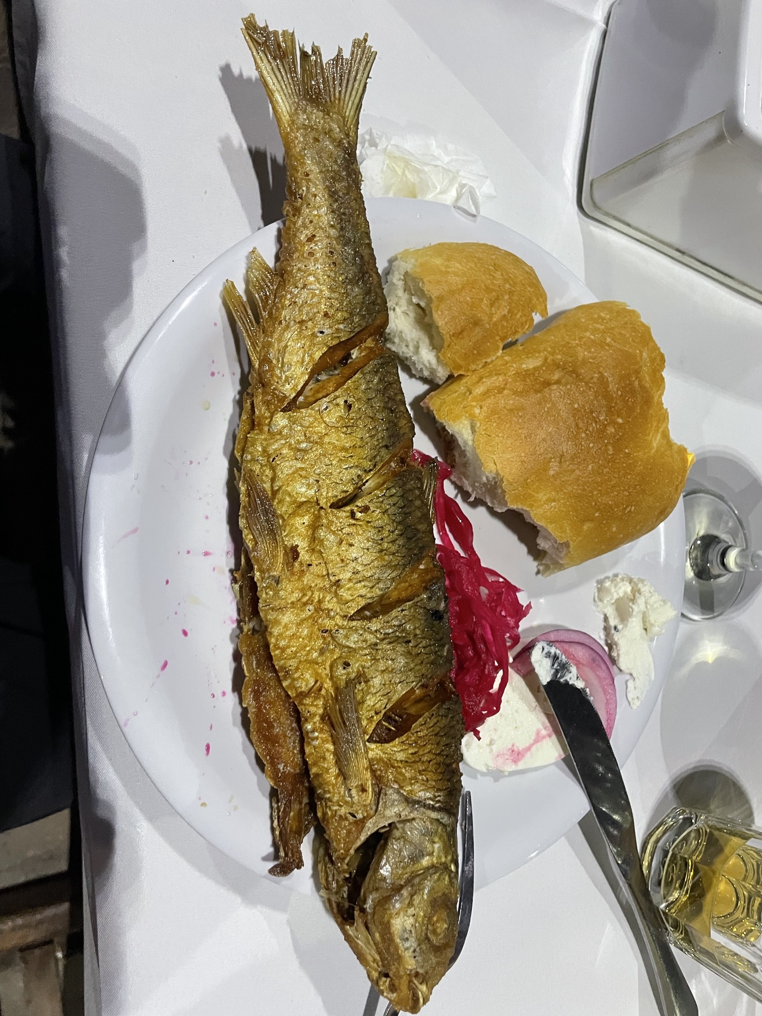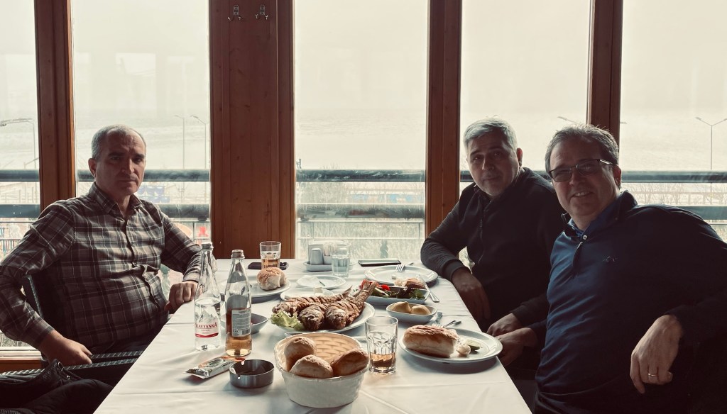 We lived in trendy neighborhood and this lovely breakfast was just down the block. Below, Nazim brought me to many nice restaurants. This is a fish restaurant overlooking the Caspian sea with our friend Bagush.