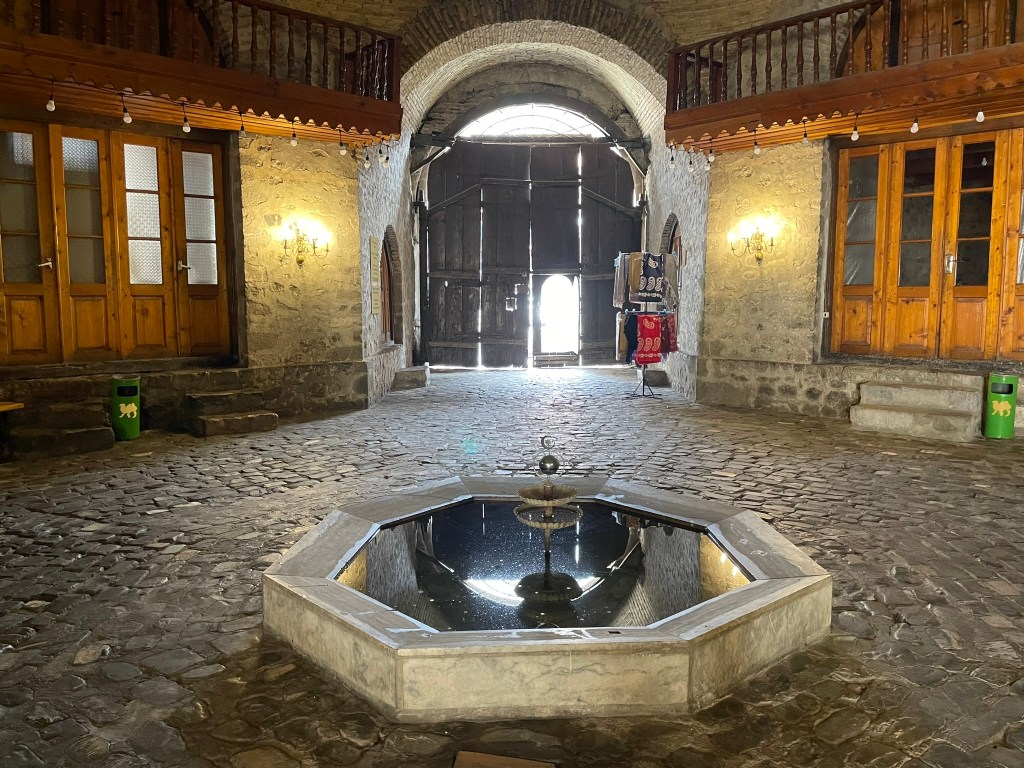 This is the actual door to our Caravan accommodations. Built in the 1700’s it accommodated traders as well as their goods and animals. While a little rustic, we stayed in a historic inn on the silk road. The receptionist told Nurlan that Azerbaijanis don’t stay their much, but foreigners love the place. Below is the entrance on the other side of the door and then the inner courtyard.