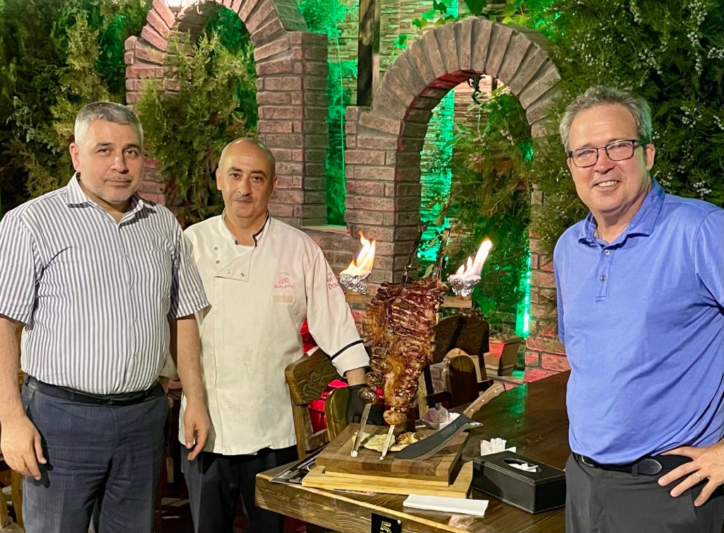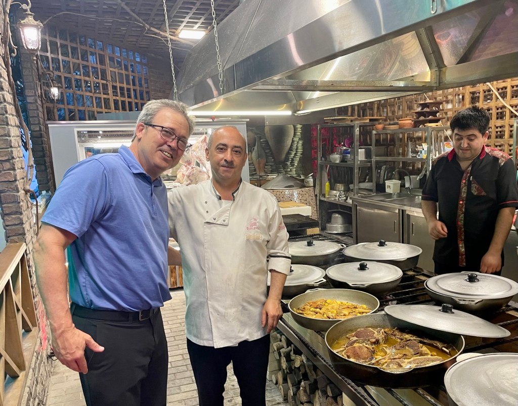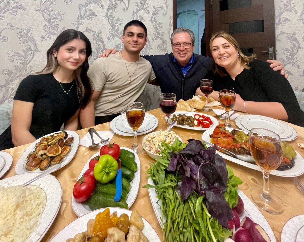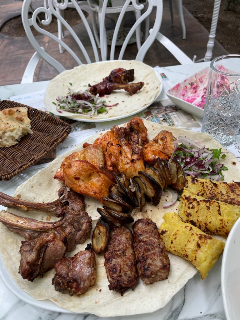 Of course the food, drink, and sharing of meals has been an important part of our journey. Above is traditional dance and costume at a Azerbaijani restaurant I visited for a work function. It really helped to have our Azerbaijani friends show us how to order and get the most out of our dining experiences in restaurants. And, we shared a few meals in our friends’ homes, which was extra nice. Below is a beautiful plate of grilled lamb, chicken, lamb and beef kebabs, potatoes, and eggplant.