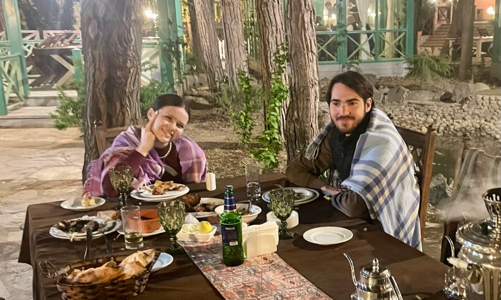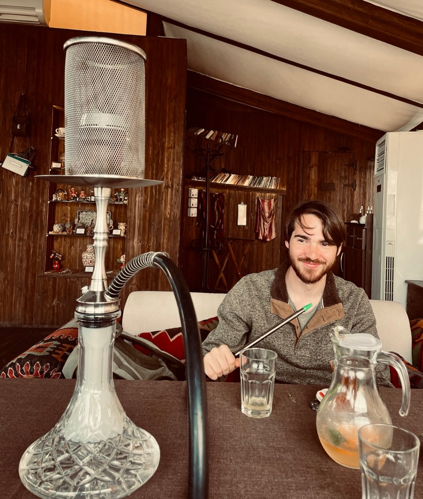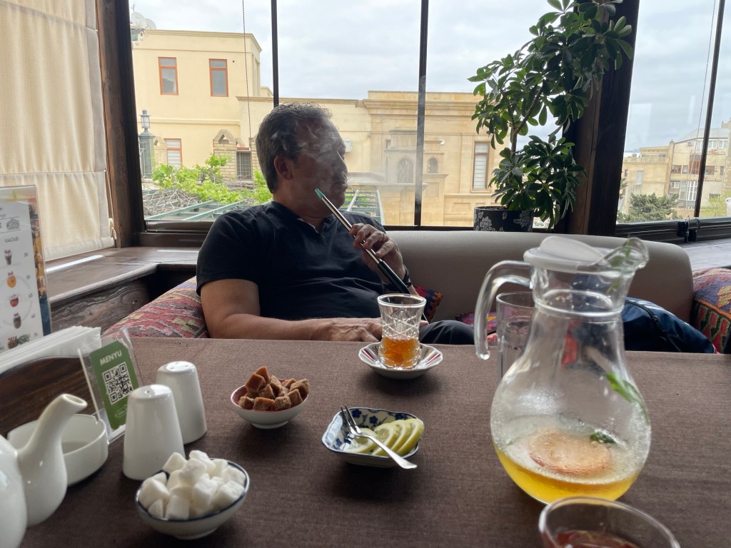Above, we are eating Gutab roadside- on our trip to Sheki and here with Andrew and Nick in Ganja. Below, Nick and I taking advantage of the cafe culture in Baku and trying the traditional shisha.