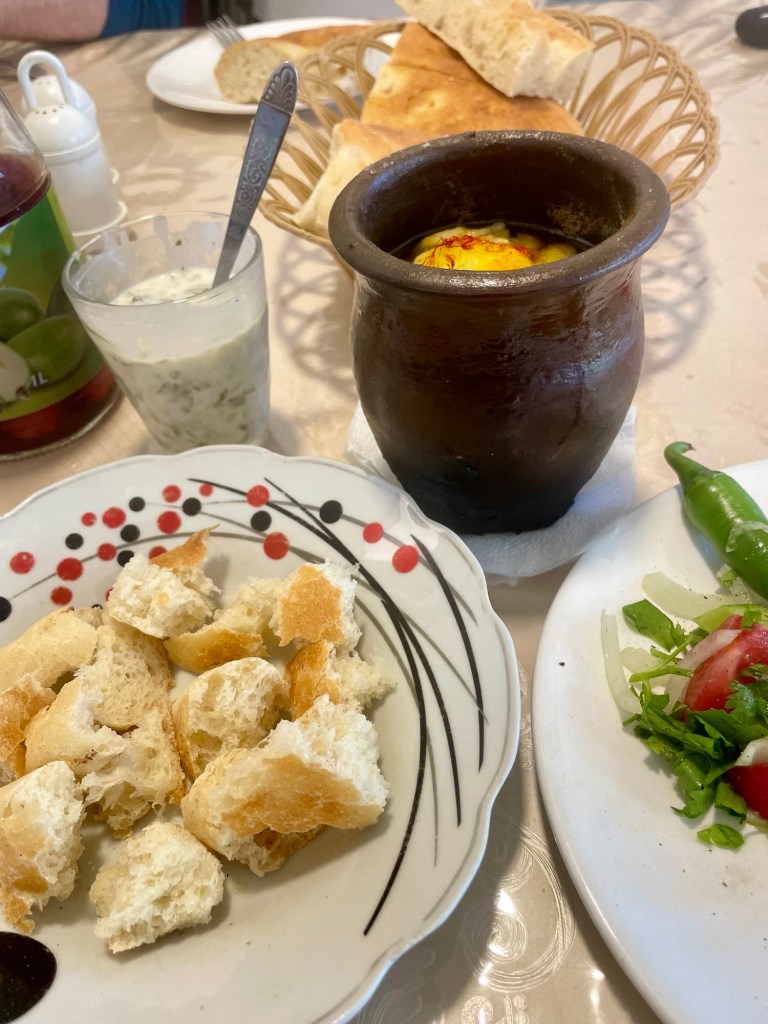We met up with Sohini who knows where to eat well in Sheki. Sohini was working teaching English over the weekend, but pointed us in the right directions and met us for two lovely dinners. We travel with Sohini and Nurlan again to Gobustan the next month. Below is a neat dish, Piti, where you start by pouring the rich stew broth over bread before continuing with the lamb stew in the same bowl.