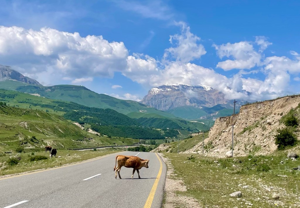 Our first destination was Shahdagh mountain. From Wikipedia, Mount Shahdagh (Azerbaijani: Şahdağ; Lezgian: Кас сув) is a mountain peak of the Greater Caucasus range, located in the Qusar District of Azerbaijan, close to the border with Russia. The elevation of the peak is 4,243 metres (13,921 ft) above sea level.[1] Pretty picturesque with cooperative livestock. I took 20 pictures of the exact same image.