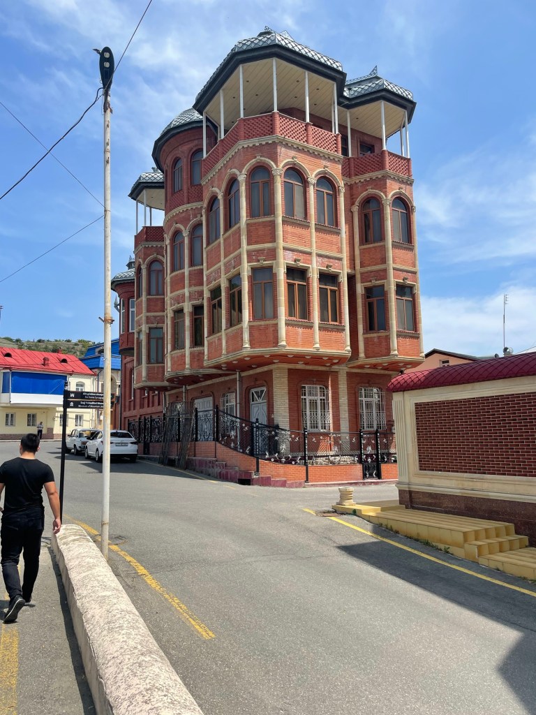 The meals on our excursions are traditional Azerbaijani salads and grilled meats. Below, some interesting buildings. I am amazed by the interesting buildings all over Azerbaijan.